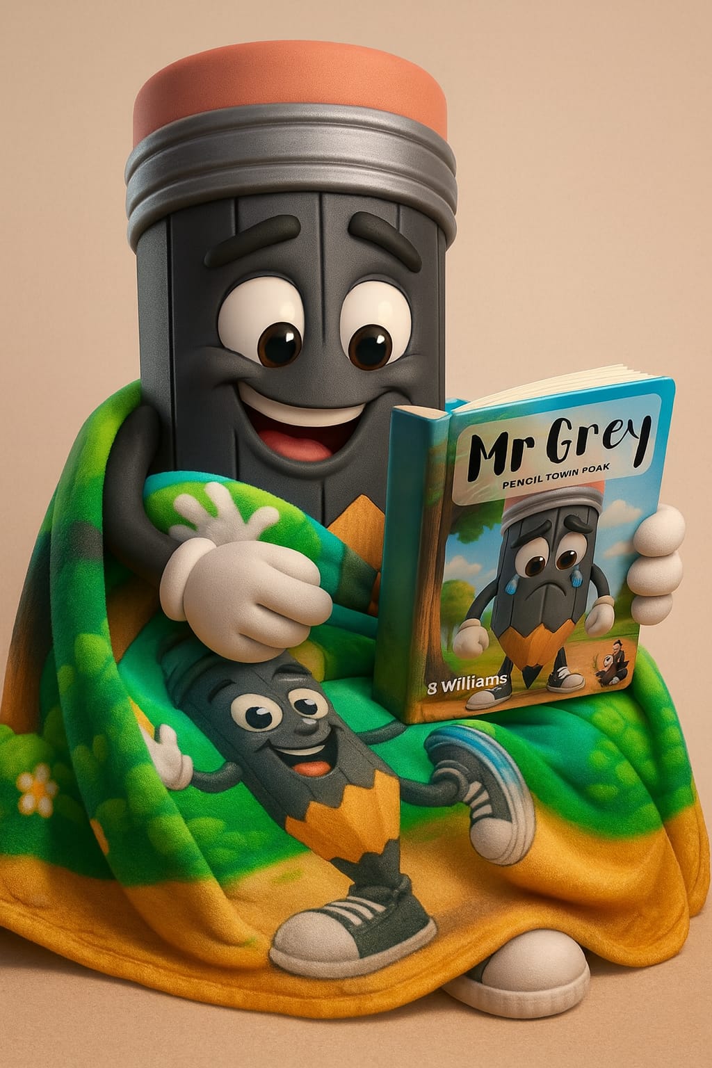 1 copy of Mr. Grey, 1 woolly PencilTown character blanket, bundled in your very own PencilTown Folk Bag.